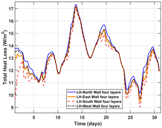 Total heat loss distribution in W/m2 as a function of time in days for the wall simulation facing North, East, South, and West.