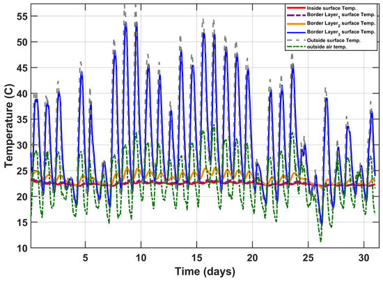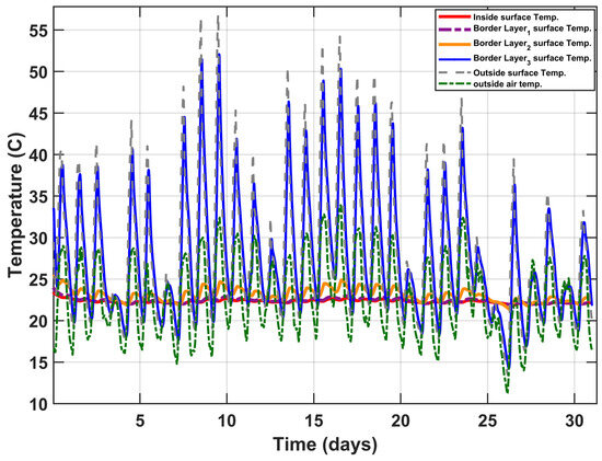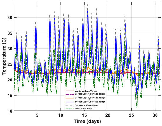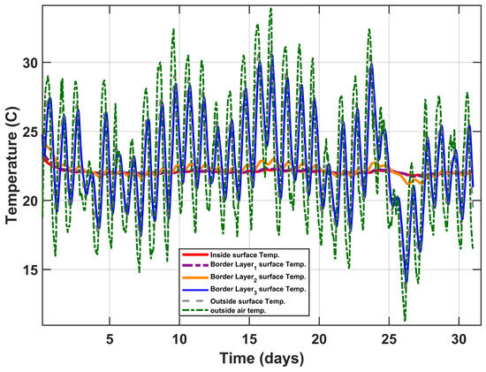 This section shows the results of a simulation of heat transfer and temperature distribution in the four-layered wall during the summer season (July), depicted in Figure 10. The simulation shows how the temperature varies across the layers and how much heat is gained from the outside to the inside of the wall per meter squared. Figure 17, Figure 18, Figure 19 and Figure 20 show the temperature distribution at the boundary surfaces of the layers when the wall faces North, East, South, and West directions, respectively. The following observations can be made from the results.