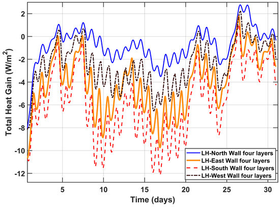 Total heat gain distribution in W/m2 as a function of time in days for the wall simulation facing North, East, South, and West.