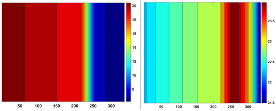 Contour of the temperature distribution in °C on the South-facing side of the building for two different seasons: winter (left) and summer (right).