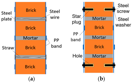 In the studies mentioned above, there are two ways of strengthening the PP band. In the first method, the PP band was tightened together by clips using tensioners and sealers [18]. This method was effective in strengthening small brick masonry patterns. However, when considering its use on walls, it is difficult to attach the PP band mesh to the wall. Almost all the walls were restrained at three or four edges. Therefore, the PP band mesh cannot wrap the wall at the intersection between the wall and column. In the second method, PP band mesh was created by using a portable ultrasonic welder. Afterwards, holes were drilled through the mortar layers in the wall and small straws/pipes were left embedded at the joints. PP band mesh can be applied to both faces of the wall with the help of connectors, which can be steel wires and PP bands [16]. When using steel wires to fasten the PP band mesh on the wall, as shown in Figure 2a, the hardness at the connection position was low. Additionally, when observed from the form of destruction in Figure 1, it was found that the surface between the mortar bricks or in the mortar layer was often where the cracks first appeared and continued to expand until failure. This raises the problem of damage to the connection position. It effectively reduces the tension ability of the PP band mesh, owing to the simultaneous displacement of both the fixed position and mesh. Therefore, to clarify this issue, we have developed a suitable PP band fixation method to enhance the hardness at the connection position, shown in Figure 2b.