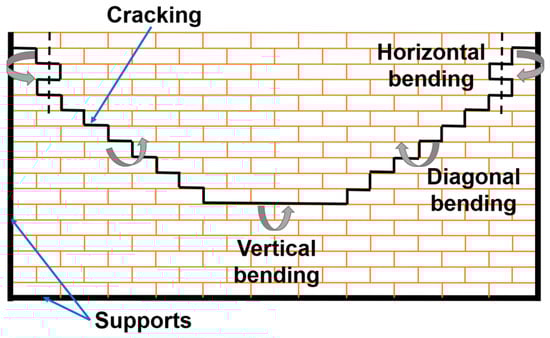 It is well known that earthquakes are one of the leading causes of the collapse of masonry structures, and the two major seismic-induced damage and collapse models of masonry walls are the in-plane and out-of-plane collapse mechanisms. The URM structures are much weaker in the out-of-plane direction than in the in-plane direction [19]. Out-of-plane loading (perpendicular to the loading direction) is created by wind gusts in typhoons, leading to the collapse of houses. It is more dominant than the in-plane failure of URM walls [20]. However, most masonry walls involved in real semi-permanent houses are supported on three or four sides. These boundary conditions lead to the assumption that the walls are subjected to bi-axial flexion when subjected to out-of-plane loads. The failure models of two-way spanning walls depend on the panel dimensions and support conditions. Consequently, the wall undergoes a combination of horizontal, vertical, and diagonal flexions, which must be investigated (Figure 3).