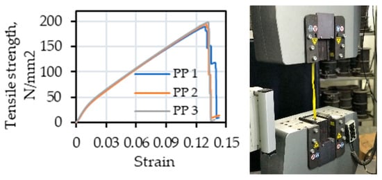 The specimens were strengthened using a PP band (popularly used as a carton packaging material). We evaluated the tensile properties of PP bands with dimensions 15.5 mm × 0.5 mm × 500 mm (width × thickness × length) according to JIS Z1527:2002 [27]. Figure 4 exhibits the setup used for the tensile test. The properties of the PP bands used in this investigation are listed in Table 2.