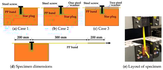 The installation process is straightforward and does not require skilled labor. The preliminary assessment of the proposed method in the direct tension tests was performed on three cases: (1) using only steel screws (5 mm dia. × 25 mm) (Figure 5a), (2) using steel washers and PP bands placed between the steel washers and bricks joined using steel screws (Figure 5b), (3) using two steel washers with the PP bands placed between them and joined by steel screws (Figure 5c). Each case consists of three specimens with dimensions as shown in Figure 5d. The lengths of the PP bands and loading method were selected in accordance with JIS Z1527:2002 [27]. First, we drilled 6 mm holes in the bricks using an electric drill. The diameters of the holes were sized to ensure a tight fit with the star plugs (6 mm dia. × 25 mm). The tightening force applied to each steel screw was adequate to hold the PP bands firmly in the plane. Figure 5e presents the specimen layouts.