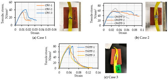 The tensile stress–strain curves for the different investigated cases are presented in Figure 6a–c. It is observed that in Case (1), the average tensile strength and strain were the lowest at 36.5 N/mm2 and 0.013, respectively (Table 3 and Figure 6a). The PP bands were damaged and separated from the steel screws. Case (2) showed the good bonding ability of the PP bands and rough brick surfaces under the effect of the initial twisting force. The slide in strength of the PP band on the steel washer is also observed in Figure 6b, at a strain range of 0.024 to 0.036. However, in terms of the tensile strength and strain, they were still lower than those in Case (3). In Case (3), the average tensile strength and strain were the highest at 81 N/mm2 and 0.046 (Table 3 and Figure 6c). It was observed that the connection in Case (3) was the best compared to the other cases. The deformation at the linking part between the steel washers and PP bands does not occur suddenly but is sustained awhile at the edge of the undamaged hole. Therefore, it is advisable to use two steel washers to strengthen the specimens.