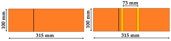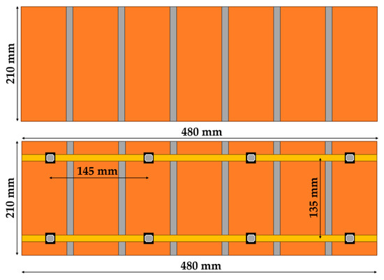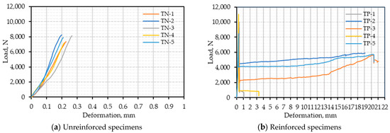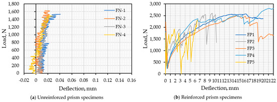 Load–deflection relationships of unreinforced specimens at the center are displayed in Figure 14a. The failures of the unreinforced prism specimens were sudden and brittle. Most prism specimens were split into two pieces (Figure 15a). The failure of the specimen was caused by a crack that appeared near either side of the loading steel rod. The average peak flexural strength, average deflection, and average load-carrying capacity of the specimens at the center were 0.343 N/mm2, 0.026 mm, and 0.163 kNm, respectively (Table 6).