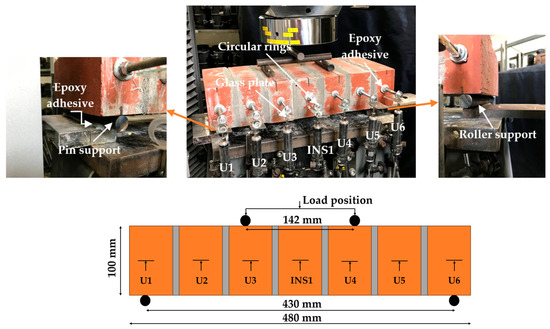 Fourteen linear variable displacement transducers (LVDTs) (U1 to U12; INS1 and INS2) were installed along the horizontal central line of the specimen at two sides to measure the prism displacements during the test, as shown in Figure 8. Two LVDTs (INS1 and INS2) at the specimen center position and load cell were connected to the data acquisition system of the universal testing machine (INSTRON). Due to limitations in the output of the system in Instron, only two LVDTs were used. The others were connected to a fast data logger (U-CAM). The load rate for all prism specimens was kept at 0.005 mm/s. Timing synchronization between the U-CAM and Instron data was performed.