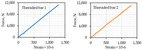 Direct tension force–strain curves of the threaded bars.