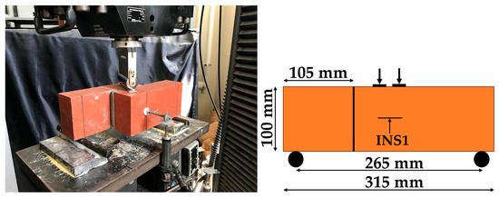 To measure the displacement of the specimen, two LVDTs (INS1 and INS2) were placed at the mid-span of the specimen at two lateral faces, as shown in Figure 13. They were connected to the INSTRON machine. The load rate was kept at 0.005 mm/s.