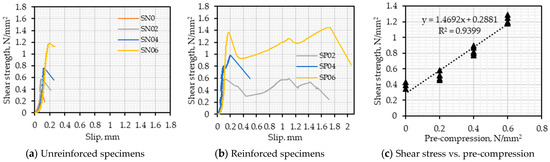 Shear stress–slip curves for the unreinforced and reinforced specimens and the relationship between shear stress and pre-compression stress.