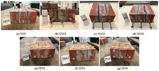 Moreover, failure patterns of the unreinforced specimens are displayed in Figure 17a–d. In cases of pre-compression (0, 0.2, 0.4 N/mm2), cracks appeared at the mortar–brick interface, while with 0.6 N/mm2, the observed failure mode was a combination of sliding along the mortar–brick interfaces and diagonal cracks appeared near the interface through the mortar layer. A minor crack was also observed propagating into the central brick at the peak load. The failure patterns of the reinforced specimens are also presented in Figure 17e–g. It was observed that the reinforced specimens with PP bands did not sustain failure mode changes, and cracks appeared at the mortar–brick interface in all cases of pre-compression. At 0.6 N/mm2, cracks were also observed in the central brick.