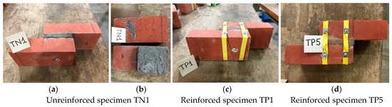 The load and deformation relationships of the unreinforced and reinforced specimens are presented in Figure 18, and the results are summarized in Table 9. The failures of the unreinforced specimens were sudden and brittle. The improvements in the average load-carrying capacity and deformation ability at first crack were 1.21 times and 1.47 times, respectively. The load suddenly dropped and no longer increased. The ductility evidently increased. Cracks occurred at the mortar–brick interface (Figure 19a,b). In the reinforced specimens, after failure, slight increases in load were observed in the TP-2, TP-3, and TP-5 specimens until the PP band’s fixed positions were ruptured (Figure 19d). However, it did not exceed the peak load. This circumstance was not the same as that in the flexural test. However, the PP band effectively increased the collapse time of specimens. Unlike the cracks that appeared in the TP-2, TP-3, and TP-5 specimens, cracks in the TP-1 and TP-4 specimens appeared in both the brick and mortar layer and bricks (Figure 19c). This was because the strengthening method creating a pre-tensioning force appears in the PP band, helping to increase the load-carrying capacity of the reinforced specimen.