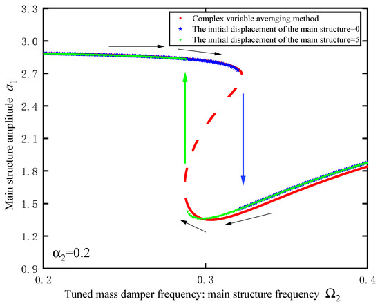With the aforementioned parameter settings, the frequency ratio–amplitude curves can be seen in Figure 3. It is worth mentioning that the units in Equations (4) and (5) have been removed by dimensionless transformation. As a result, there are no unit symbols on the axes in Figure 3 and subsequent figures. Upon observing Figure 3, it becomes evident that the figure illustrates the presence of multivalued solutions in certain regions, with the solutions in these corresponding areas being unstable (indicated by the dotted portion of the red curve). Using the Runge–Kutta method, calculations were performed with the initial displacements of the primary structure set to 0 and 5, respectively, while keeping other initial conditions at 0. As depicted in Figure 3, when the initial displacement of the primary structure is set to 0 (blue curved portion), the steady-state amplitude occurs in the upper branch within the unstable frequency band of the tuned mass damper and transitions to the lower branch when the frequency surpasses the unstable region. Conversely, when the initial displacement of the primary structure is set to 5 (green curve part), the steady-state amplitude within the unstable frequency band appears in the lower branch of the graph and transitions to the upper branch as the frequency decreases beyond the unstable frequency band of the tuned mass damper. In summary, large initial displacements result in small amplitudes in the main structure, whereas small initial displacements lead to large amplitudes in the main structure. Additionally, these amplitudes may experience jumps as the TMD frequency changes. The occurrence of such a jumping phenomenon poses significant risks in engineering practice and should be avoided whenever possible. Therefore, the setting of the initial displacement is of some significance in reducing the steady-state amplitude of the structure.