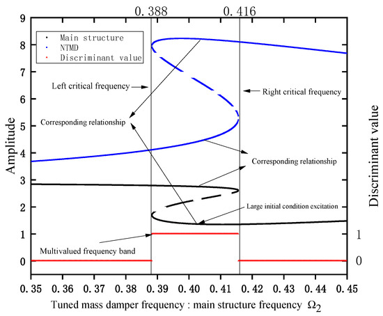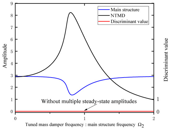 The correctness of the discriminant requires verification. Figure 4 displays the corresponding frequency ratio–amplitude curves and frequency ratio–discriminant plots when the nonlinear coefficient . The same parameters are selected and substituted into the discriminant Equation (27) for assessment, and the corresponding discriminant rule is established as follows: if the condition in Equation (27) is met, indicating that the nonlinear tuned mass damper system is in a stable state, the discriminant value for that point is set to 0; if the condition in Equation (27) is not met, signifying instability in the nonlinear tuned mass damper system, the discriminant value for that point is set to 1. Following the established discriminant rule, the discriminant values corresponding to the frequency ratios depicted on the right vertical axis of Figure 4 can be determined. It is evident from the amplitude curves of the primary structure and NTMD in Figure 4 that there are no multivalued solutions for the structure with this parameter setting. All the frequency ratios in Figure 4 correspond to discriminant values of 0. As per the established rules, it can be concluded that the system does not exhibit multivalued solutions under the current parameter setting, consistent with what is indicated by the amplitudes of the primary structure and the NTMD.