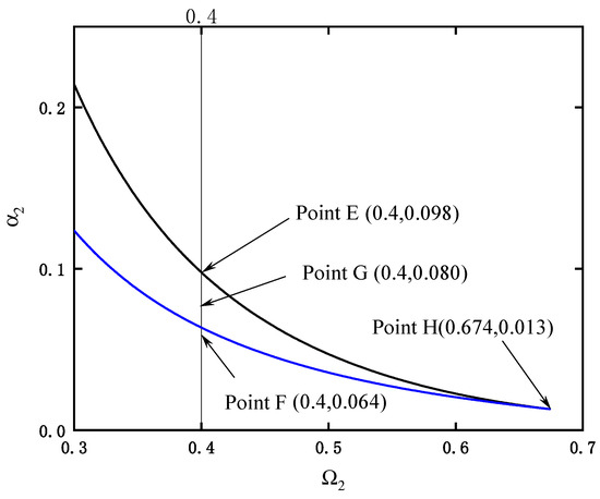 All parameters are held constant, with the exception of setting the damping ratio to 0.1. Using the approximate analytical solution method, a curve illustrating the relationship between frequency ratio and nonlinear coefficient is obtained. This curve takes on the shape of a knife edge, featuring an inflection point on the right side of the graph, as depicted in Figure 6. Upon closer examination of the graph, vertical lines are added at the position where , revealing three distinct special value points labeled as E, F, and G. Additionally, on the right side of the curve, an inflection point labeled as H is identified, yielding a total of four special points. Point E represents the larger nonlinear coefficient corresponding to time, point F represents the smaller nonlinear coefficient corresponding to time, point G represents the nonlinear coefficient in the middle region, and point H represents the frequency ratio and nonlinear coefficient of the inflection point in the graph. We studied the effect of changes in nonlinear coefficients on the steady-state amplitude of the primary structure under the coefficients corresponding to special value points E and F, and analyzed the meaning expressed by the frequency ratio–amplitude plots corresponding to special value points G and H.