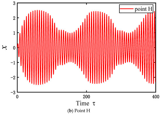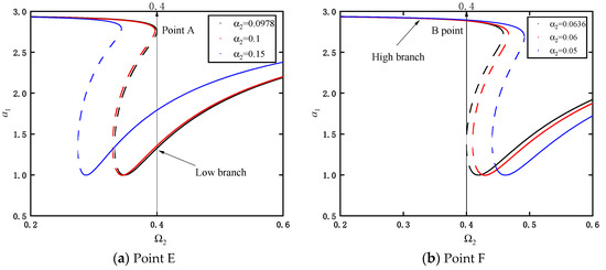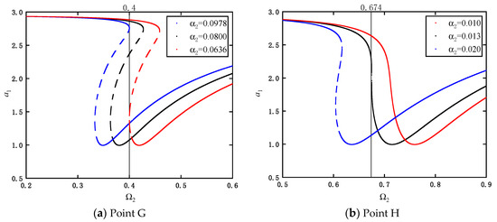 As shown in Figure 8a, when and , the frequency ratio corresponds to the main structure amplitude, which appears both in the high and low branches of the curve. The region where point G is located is between points E and F and the nonlinear coefficients obtained in this region correspond to the nonlinear coefficients obtained when point E is decreased and point F is increased. Therefore, in this region, the system inevitably generates multivalued solutions, and the main structure amplitude varies with the parameters and is very unstable.