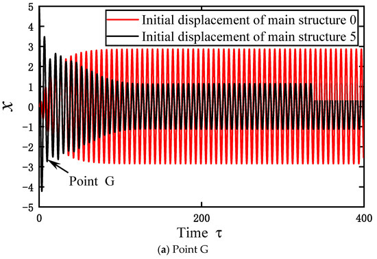 From the four special value points E, F, G, and H, the corresponding time history diagrams of the main structure’s displacement can be obtained, as shown in Figure 9a, Figure 9b, Figure 10a, and Figure 10b, respectively. The displacement time history diagrams obtained from point E reveal that the main structure’s displacement is small during the steady-state phase. Conversely, the displacement time history diagram obtained from point F shows that the main structure’s displacement during the steady-state phase is larger. An observation of the displacement time history diagrams obtained at point G indicates that the magnitude of the main structure’s displacement during the steady-state phase varies with the initial displacement conditions. Point H is at a critical point, and, therefore, its displacement time history diagrams show that the main structure’s displacement constantly oscillates between large and small.