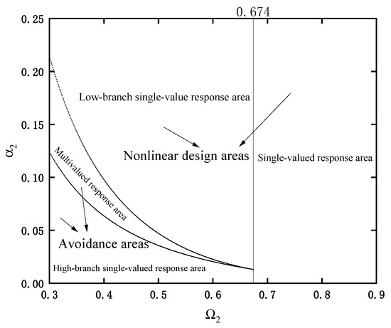 As shown in Figure 8b, when and , the frequency ratio corresponding to the amplitude of the main structure is in a stable critical state, and neither the change of the frequency ratio nor the nonlinear coefficients lead to the appearance of multivalued phenomena. When the frequency ratio increases or the nonlinear coefficient increases, the main structure amplitude can be stabilized in the lower branch of the curve and only single-valued solutions appear.