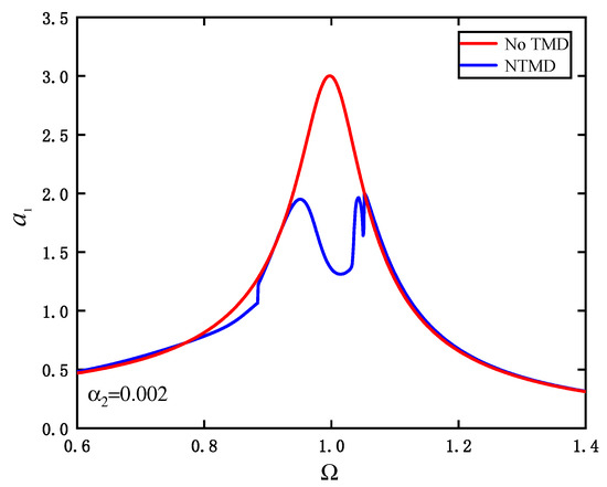 Based on the previous analysis, we set the parameters and , while keeping the rest of the parameters unchanged. These parameters are within the area of the single-valued solution. The amplitude–frequency response curve of the main structure is shown in Figure 12. As seen in the figure, the main structure controlled by the NTMD exhibits better control performance across all frequency bands and effectively reduces the amplitude at the 1:1 resonance. These results demonstrate that by selecting parameters within the single-valued solution area, the parametric design of the NTMD yields better control outcomes at different external excitation frequencies.