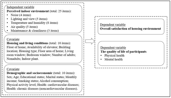 For the covariate, ten items were used to measure respondents’ housing and living conditions [68,74,75], including the floor of the home, availability of elevators, building location, housing type, and floor area of the home. Additionally, respondents’ demographic, socioeconomic, and general health statuses [76,77] were collected, including sex, age, educational status, marital status, monthly income, lifestyle (physical activity level, smoking, and alcohol consumption), and health status (cardiovascular diseases and chronic diseases).