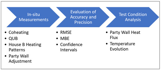 A field-based study was chosen, over a theoretical or computational approach to account for the unpredictable and complex nature of party wall heat transfer, which may not be accurately represented in these evaluation methods. Figure 1 presents a high-level overview of the method.