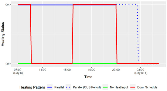 Multiple heating scenarios were applied to the control house to replicate neighbouring heating patterns that will influence party wall heat transfer. This is assuming that due to the solid party wall, heat transfer will be proportional to ΔTPW. The heating patterns are visualised in Figure 4 and described as follows: