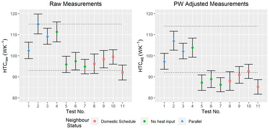 A comparison between the HTCraw QUB and coheating measurements can be viewed in Figure 5. The tests completed with the control house in the heating pattern “parallel” appear clustered higher than others. For the raw results, this is unexpected as the guarding across the party wall in this heating pattern is expected to reduce or eliminate party wall heat transfer. The range of HTCraw measurements, 23% relative to the mean, is comparable to studies of repeated QUB tests without a party wall present [24]. The QUB HTCraw measurements are also shown to be accurate against the coheating test. Each test shows overlapping uncertainty bounds with coheating independent of the control house heating pattern. This suggests that in the conditions of the study, the impact of party wall heat transfer could be negligible in contributing to the accuracy and precision of measurements.