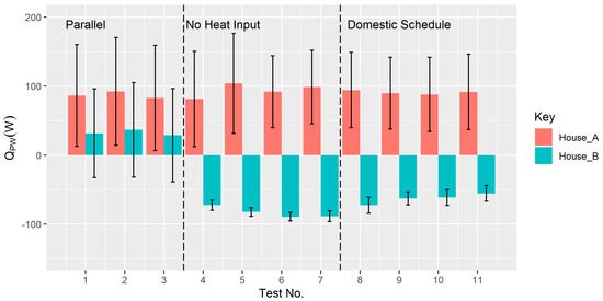 The QPW values for each QUB test are shown for both houses in Figure 6; the error bars depict the standard deviation of QPW values recorded across the duration of the QUB test. For tests completed in the parallel heating pattern, there is notable heat flux occurring from both sides of the party wall. This is despite the mirrored conditions in each house resulting in ΔTPW < 1 K. Without the context of the coheating result demonstrating that the party wall heat transfer is coplanar, these results could indicate the presence of a party wall bypass. This observation can be explained by the party wall exhibiting charging effects throughout the QUB tests, whereby it is storing heat and becoming thermally “charged”. In this period, the heat flux density measurements reflect heat charging the fabric and contributing to the internal temperature increase. They do not record heat leaving the thermal boundary of the house. For the tests completed with House B in the “no heat input” and “domestic schedule” heating patterns, House B records a negative heat flux (heat gain into House B); however, the party wall still records a net heat rate input of 19 W on average. The lower dispersion in heat flux for House B (smaller error bars) for tests 4–11 is a consequence of no direct heat input into the property during these QUB tests.