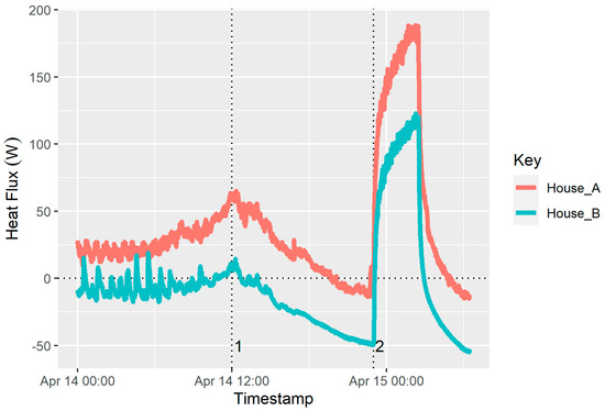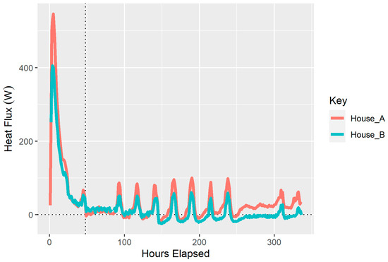 The party wall heat flux recorded during the coheating test for both houses is shown in Figure 7. This shows that the party wall also exhibits substantial charging at the commencement of the coheating test. After approximately 48 h, the profile of the heat flux becomes more stable, oscillating between positive and negative with spikes in each day presumably caused by diurnal solar patterns. When using heat flux density measurements, it is desirable to shield them from direct solar radiation by placing them on elevations out of the path of direct solar. As the instruments needed to be fixed to specific elements, it was not possible to eliminate this completely.