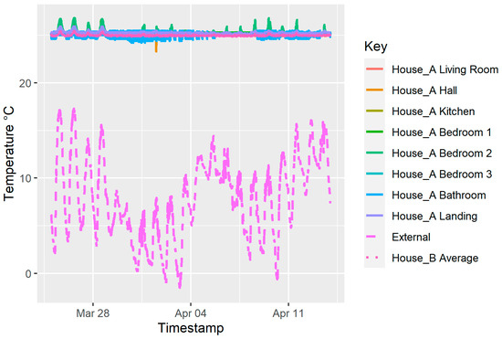 Throughout the coheating test, some slight variation in internal temperature is unavoidable due to phenomena such as the stack effect and solar heat gain. In House A, the range of internal temperatures was, on average, 0.4 K between the highest and lowest temperature at any point over the duration of the measurement.