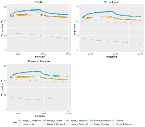 With house B in the parallel configuration, the average value of ΔTPW was 0.8 K, 4 times larger than coheating. For the no heat input and domestic schedule tests, the average ΔTPW values were 3.9 K and 3.3 K, respectively.