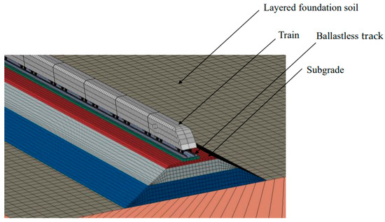 This section mainly focuses on the theoretical methods and parameters related to the establishment of the finite element model of the train-track-foundation soil. Because ABAQUS 2021 can better simulate the nonlinear contact problem between wheels and rails and the explicit integration algorithm in ABAQUS can solve highly nonlinear quasistatic problems, complex contact problems, and high-speed dynamic loads, the explicit dynamic integration method (ABAQUS/Explicit) is used in this study. A schematic diagram of the model is shown in Figure 2.