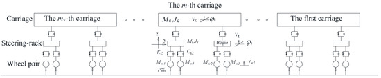 The motion of the vehicle system in the vertical longitudinal plane can be considered a multirigid body system, and the vehicle body model with a secondary spring mass is used. The following assumptions are used for the model [2]. Only the wheel–rail vertical dynamic effect is considered in the model. The car body, bogie, and wheelset are regarded as rigid bodies, and the influence of the deformation of these components on the overall model is not considered. The wheelset and the bogie are connected by a series of springs and damping elements; the connection between the bogie and the car body is composed of a second series of springs and damping elements. The masses of the car body, bogie, and wheelset are simplified as centralized mass considerations. The single vehicle part of the overall model has 16 degrees of freedom, such as the ups and downs of the car body and the three-way nodding, the ups and downs of the front and rear bogies and the three-way nodding, and the ups and downs of the four-wheel sets.