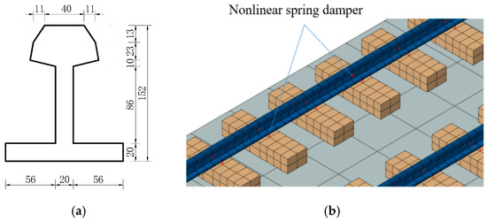 To prevent the occurrence of an hourglass phenomenon where the unit lacks stiffness and cannot resist deformation, each unit adopts an hourglass control. The actual connection between the rail and the sleeper is a fastener, which is used to limit the vertical displacement of the rail through tension. Therefore, in ABAQUS, the fastener is simulated with a nonlinear spring-damper element that can only be tensioned, as shown in Figure 4b. The actual track board is connected by many standard-length track boards, but considering the strong longitudinal connection between the track boards, this model will not model the standard track board and then consider the longitudinal connection but, instead, will model the overall structure of the track board and other structures in the longitudinal direction. The convex retaining platform and other lateral limiting devices that play a longitudinal limiting role will not be physically modeled, and their limiting effect will be replaced by specifying boundary conditions for the track structure. The material parameters of the track structure are listed in Table 3.