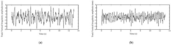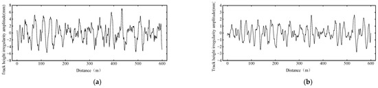 Figure 6 shows that the analytical values of the two track irregularities are also very close to the simulated values, indicating that the simulated method in this study has high accuracy and can be used for further calculation. Considering that the spacing of the rail fasteners is 60 cm, to meet the simulation accuracy requirements, a track irregularity amplitude is set every 20 cm interval in the direction of train travel. The processed sequence of the track irregularity amplitude changing with distance is shown in Figure 7.