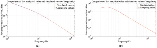 With the help of the MATLAB program and inverse Fourier transform method, the discrete data of the amplitude of track irregularity changing with time can be obtained based on the above-mentioned power spectral density function that changes with time and frequency. The results are shown in Figure 5a,b. In comparison with the current literature, it is found that the simulated amplitude of the track irregularities according to the German low-interference spectrum is very close to the data calculated by Chen et al. [34], and the amplitude of the track irregularities obtained by the Shanghai–Nanjing 350 km/h spectrum is almost the same as the amplitude in the literature [32]. To verify the precision of the simulated method in this study, the simulated results and analytical values of the two kinds of irregularity spectra are also compared, as shown in Figure 6.