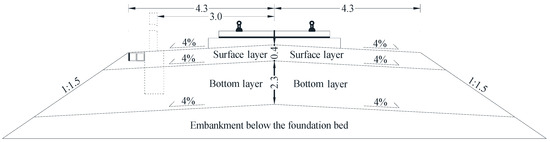 According to the “Code for Design of High-speed Railway” [35], the subgrade section of the model in this study is based on the standard cross-sectional dimensions of single-line embankments for medium-ballasted tracks, as shown in Figure 8. The specification stipulates that the surface of the subgrade should be filled with graded gravel, and considering the large deformation of the subgrade, for the accuracy of the model, the Drucker–Prager plastic material constitutive model is used for each subgrade. The parameters of each layer of the roadbed structure are listed in Table 4.