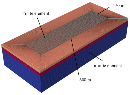 The size of the foundation soil along the length of the train is 600 m, the length of the foundation soil in the vertical direction of the train is 150 m, and the thickness of the entire foundation soil is 60 m. In addition, since the vibration wave will produce a reflection effect when it propagates to the finite element boundary, the calculation accuracy of the vibration wave will be greatly reduced. To reduce this effect, the infinite element boundary is set in the INP file of ABAQUS for the surrounding and bottom of the foundation soil. The model is shown in Figure 9. The infinite part of the Earth’s foundation is equivalent to a boundary. For the boundary at the bottom of the foundation, considering a certain depth, the influence of boundary impedance and scattering characteristics is very small, and the bottom belongs to the rock layer, so the bottom of the model adopts consolidation constraints. Furthermore, it should be noted that since the boundary of the foundation soil model has been simulated using infinite elements, the roadbed structure will not be placed at the center of the foundation soil surface but on the side close to the foundation soil surface to extract the response of surface points within the range of 4.5~49.5 m from the track center.