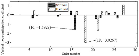 The entire foundation soil, including the subgrade section, is subjected to modal analysis, the calculation efficiency and model accuracy are considered comprehensively, and only the first 30 orders of natural circle frequencies of the foundation soil of different soil qualities are extracted. Since the vertical vibration of the foundation soil is the main concern in this study, only the participation coefficient of each order frequency in the vertical formation is extracted, as shown in Figure 10.