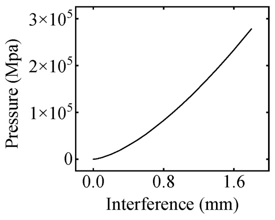 In ABAQUS/Explicit, nonlinear elastic contact is mainly achieved by setting the proportional relationship between contact pressure and interference according to Formula (3), which is set in ABAQUS/Explicit as the relationship between “softening” pressure and interference that conforms to the exponential law, as shown in Figure 11.