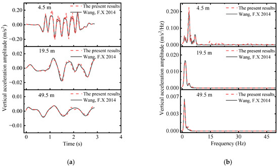 Comparison of vertical acceleration between the present results and the results in ref. [30]. (a) Vertical acceleration time history diagram. (b) Vertical acceleration amplitude frequency diagram.
