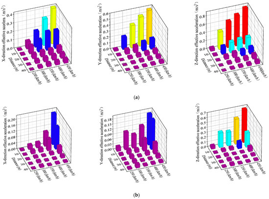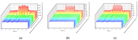 Figure 14 shows the triaxial acceleration time history curve at a distance of 1.8 m–90 m from the track center on the ground surface. The time history curves of the triaxial acceleration can better reflect the entire process of the train passing through the monitoring points. The change in acceleration amplitude in the middle part of the entire time domain can well reflect the process of the train passing through, and, due to the presence of wheels, the peaks in the triaxial acceleration time domain graph all exhibit periodic changes. The amplitude of the acceleration dynamic response in all three directions shows a decreasing trend as the distance to the center of the track increases, and the attenuation speed is first fast and then slow. At the same time, the periodic phenomenon of wave peaks caused by the wheel set effect gradually weakens as the distance to the track increases.