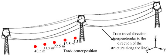 Considering the large-span and high-rise structural characteristics of high-voltage overhead transmission tower-line systems, wind load is usually the dominant load. A large number of studies have been conducted in such areas, including the design wind loads [20], wind-induced vibration [21,22,23], and galloping [24,25] of transmission tower-line systems, which provide effective technical support for the rational design and maintenance of high-voltage transmission tower-line systems. In fact, the transmission tower-line system across the high-speed railway will also be affected by the environmental vibration caused by high-speed trains. Taking China as an example, Feng et al. [26] reported that with the continuous development of power transmission capacity and railway transportation capacity, the proportion of the crossing of transmission tower-line systems and high-speed railways will continue to increase. Yin et al. [27] numerically studied the dynamic response of transmission lines under the action of high-speed trains and verified it by field tests. Zhang et al. [28] and Liu [29] analyzed the transient force and typical dynamic response of an overhead transmission tower-line structure under the action of high-speed train-induced wind. The results show that when the train passes through the overhead transmission tower-line structure, the ultimate force of the transmission line has a significant quadratic function relationship with the train speed.