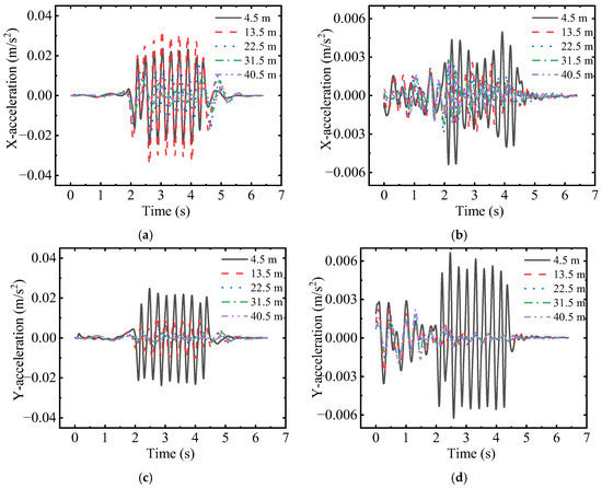 The X- and Y-direction acceleration time history diagram from 250 km/h to different distances from the track center. (a) Soft soil foundation. (b) Hard soil foundation. (c) Soft soil foundation. (d) Hard soil foundation.