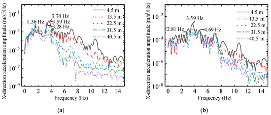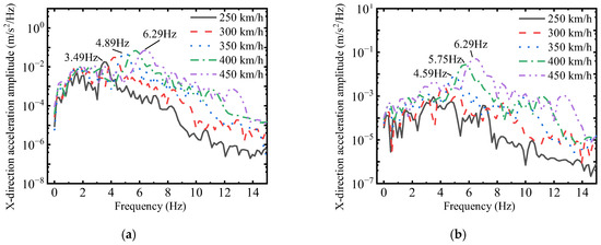 X-direction acceleration amplitude-frequency diagram at 13.5 m under soft and hard soil at different speeds. (a) Soft soil foundation. (b) Hard soil foundation.