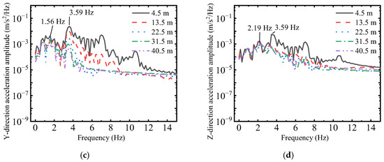 The X- and Y-direction acceleration amplitude-frequency diagram at different distances from the track center at 250 km/h. (a) Soft soil foundation. (b) Hard soil foundation. (c) Soft soil foundation. (d) Hard soil foundation.