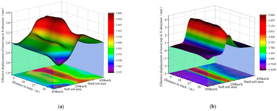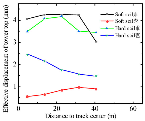 where is the effective displacement, is the displacement at different times, and is the duration of vibration action. By Formula (12), the effective displacement values of the tower top with different soil qualities and different distances from the track can be obtained, as shown in Table 11 and Figure 24.