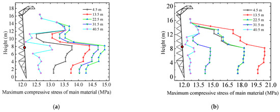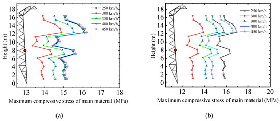 The maximum compressive stress of the main material is distributed along the height at different speeds. (a) Soft soil foundation. (b) Hard soil foundation.