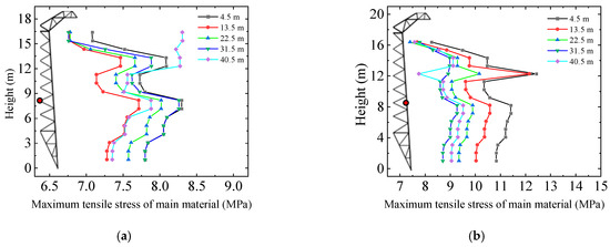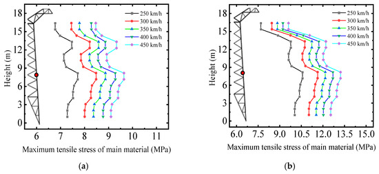 The maximum tensile stress of the main material at different speeds was distributed along the height. (a) Soft soil foundation. (b) Hard soil foundation.