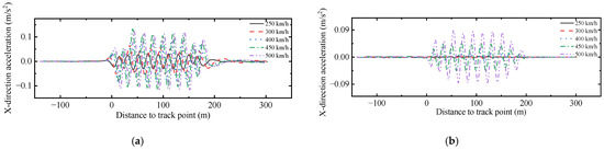X-direction acceleration time history response at 13.5 m under soft and hard soil at different speeds. (a) Soft soil foundation. (b) Hard soil foundation.